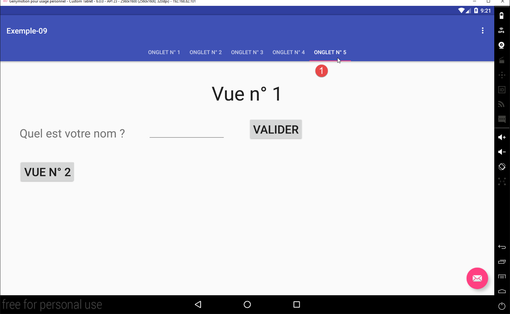 - lignes 18-23 : création du 2ième onglet. Pour savoir si on doit le créer, on regarde dans la session le n° du fragment affiché dans l'onglet 2. Si ce n° est différent de -1, sa valeur initiale, alors le second onglet est créé. A ce stade, on a deux onglets dont par défaut le 1er est sélectionné ;