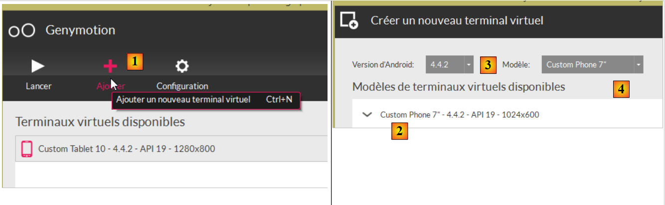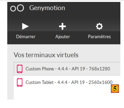 Une fois le téléchargement terminé, vous obtenez en [5] la liste des terminaux virtuels dont vous disposez pour tester vos applications Android ;