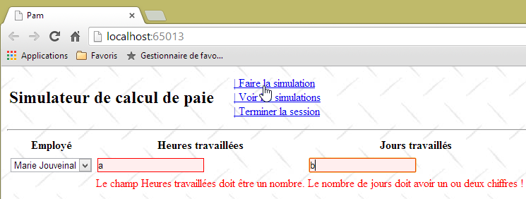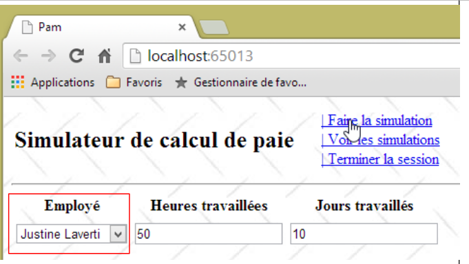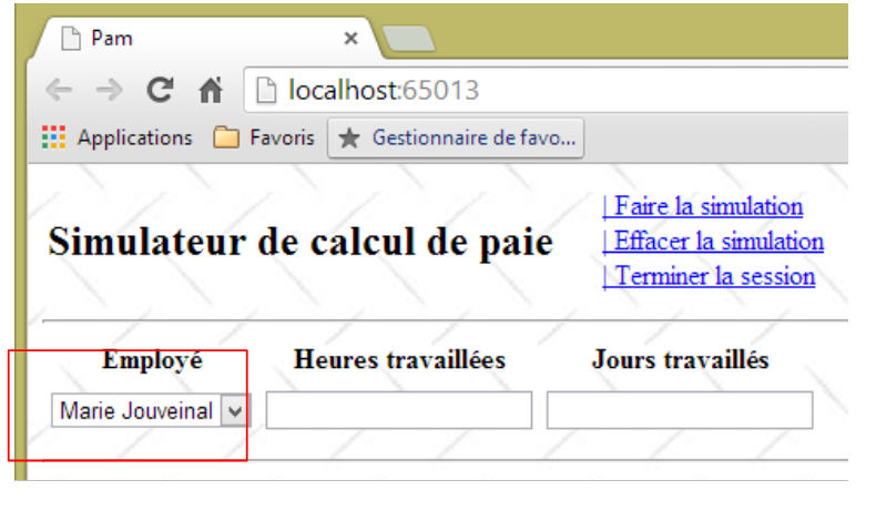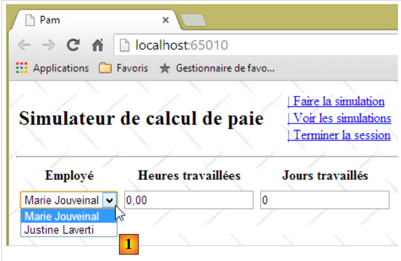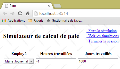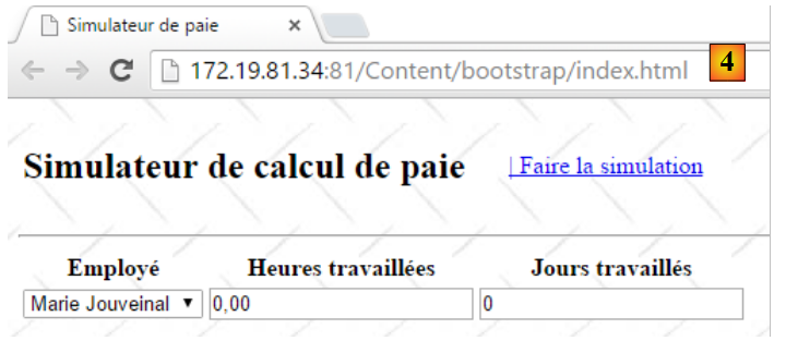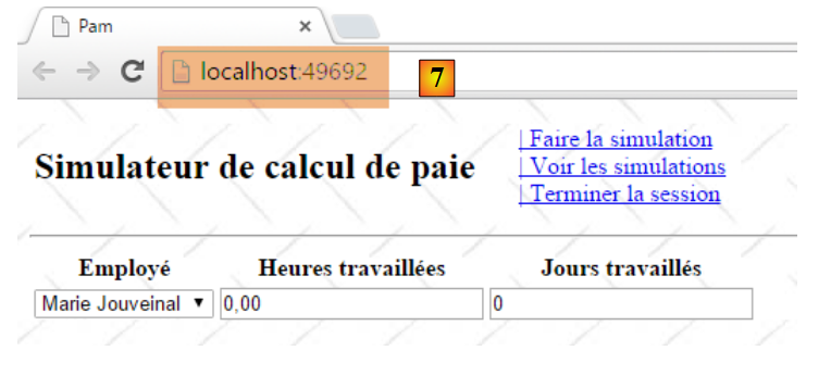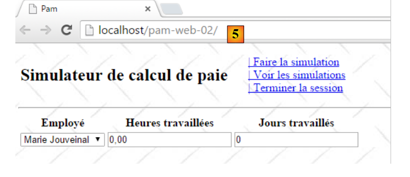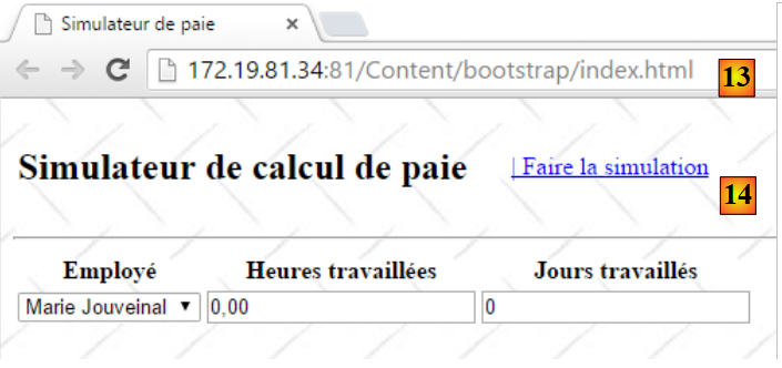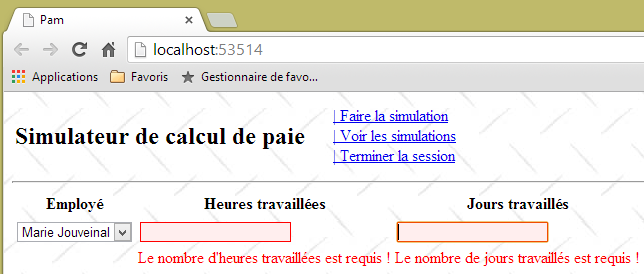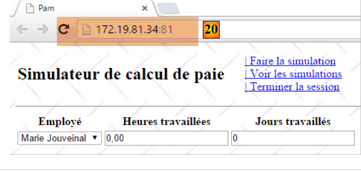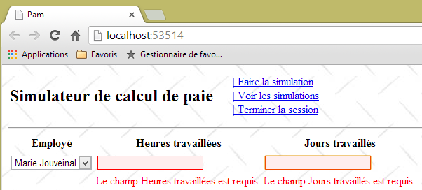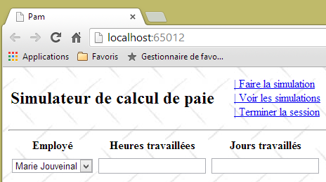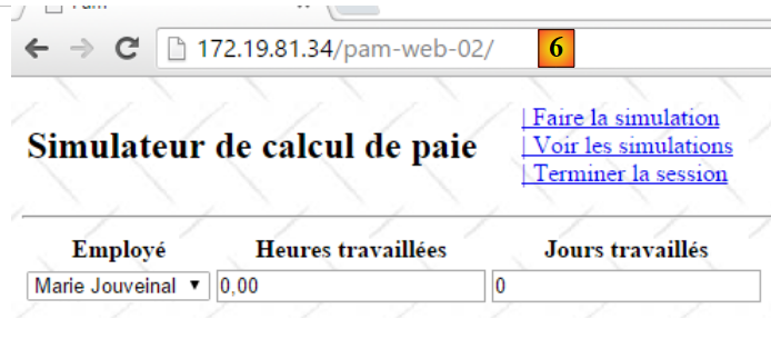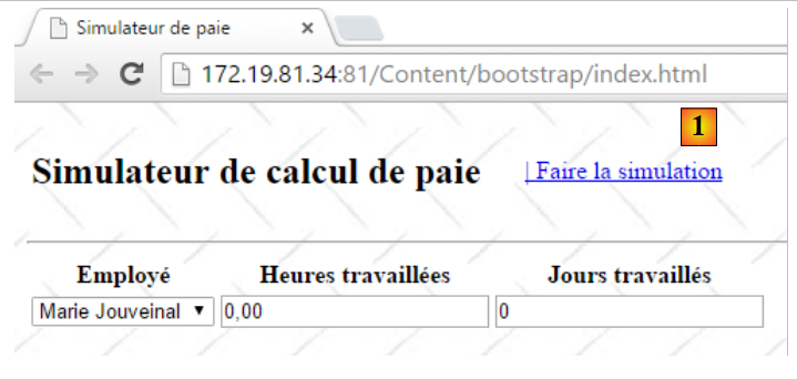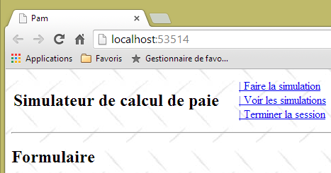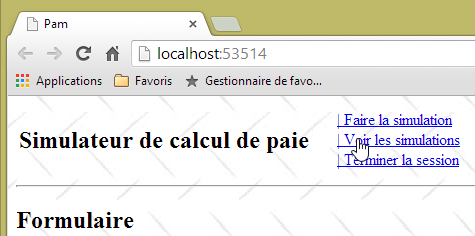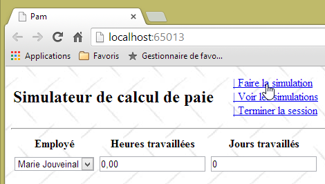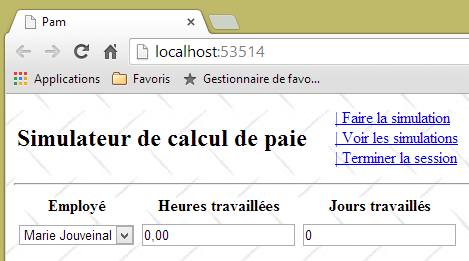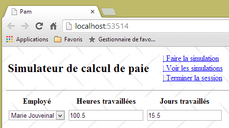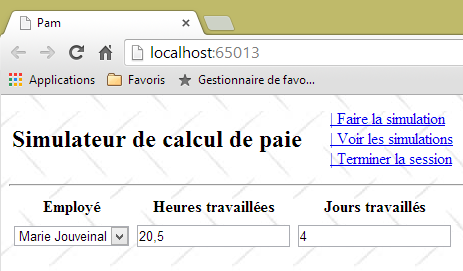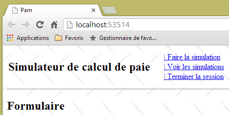 - ligne 10 : on fait un appel Ajax à l'URL [/Pam/Formulaire] du simulateur. Cette URL rend la vue partielle de la saisie des informations de la simulation (employes, heures travaillées, jours travaillés). Dans la version initiale de [pam-web-02], cette URL était suffisante. Elle était automatiquement préfixée par l'URL qui avait amené la page initiale. Maintenant, on fait l'hypothèse que la page initiale peut être fournie par un autre serveur que celui qui supporte le simulateur. Il faut alors préfixer l'URL [/Pam/Formulaire] par la variable [urlServiceWeb] de la ligne 1, qui est l'URL du simulateur (par exemple, http://172.19.81.34/pam-web-02). Cela devra être fait pour tous les appels Ajax du fichier ;