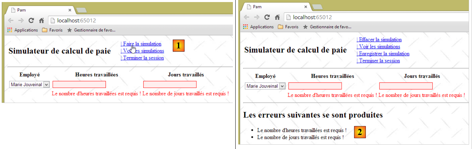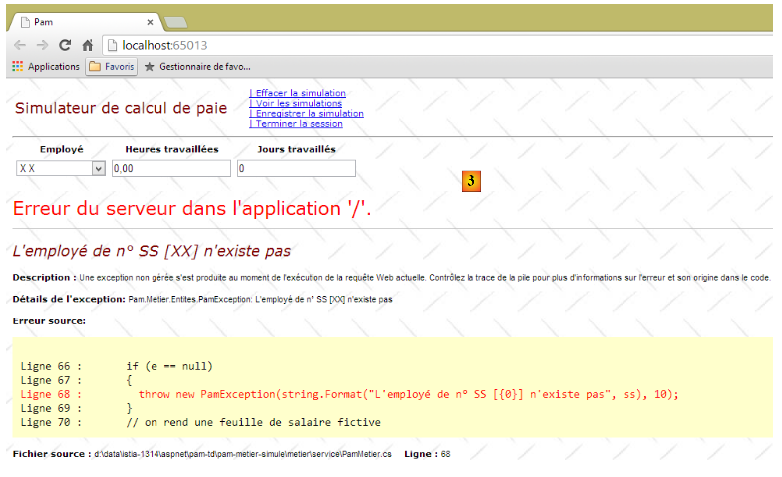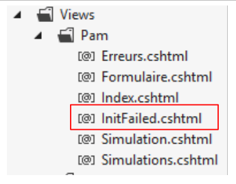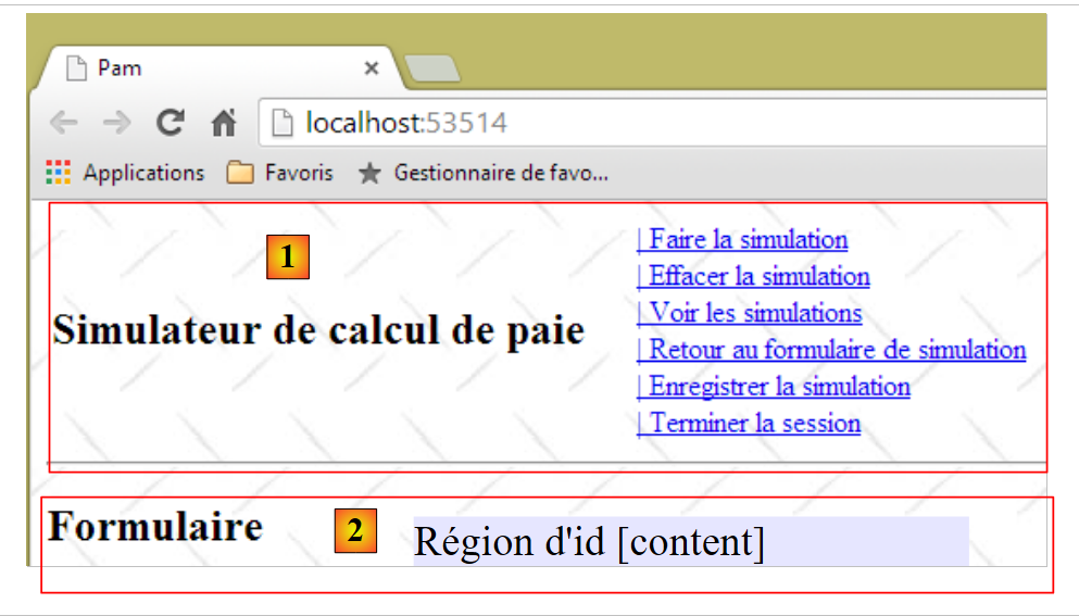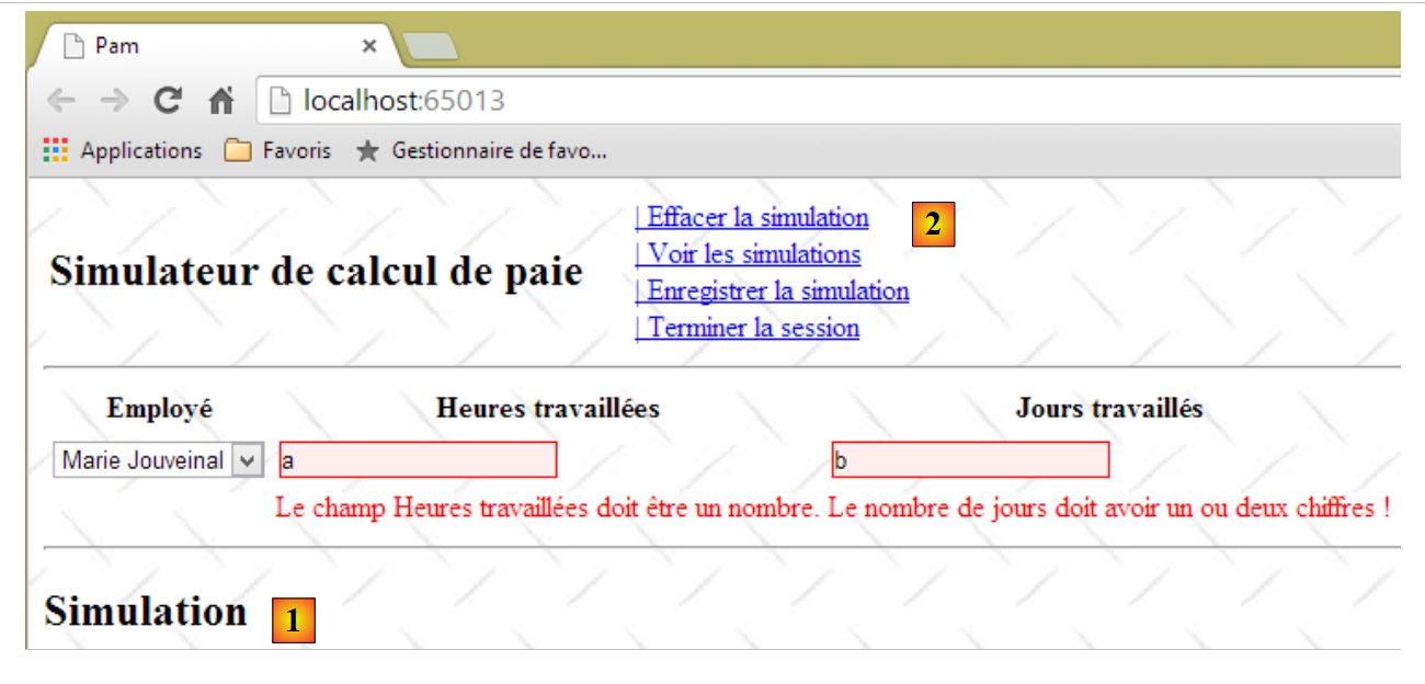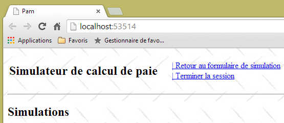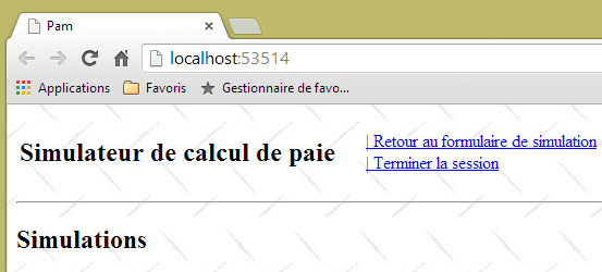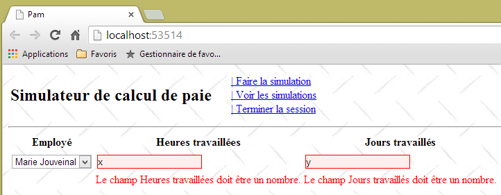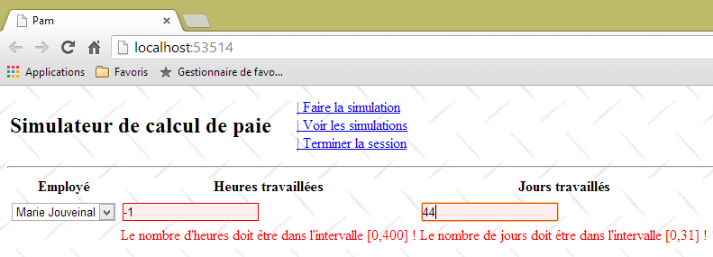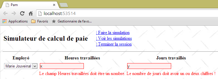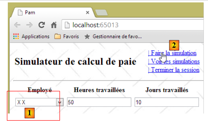 - ligne 10 : on fait un appel Ajax à l'URL [/Pam/Formulaire] du simulateur. Cette URL rend la vue partielle de la saisie des informations de la simulation (employes, heures travaillées, jours travaillés). Dans la version initiale de [pam-web-02], cette URL était suffisante. Elle était automatiquement préfixée par l'URL qui avait amené la page initiale. Maintenant, on fait l'hypothèse que la page initiale peut être fournie par un autre serveur que celui qui supporte le simulateur. Il faut alors préfixer l'URL [/Pam/Formulaire] par la variable [urlServiceWeb] de la ligne 1, qui est l'URL du simulateur (par exemple, http://172.19.81.34/pam-web-02). Cela devra être fait pour tous les appels Ajax du fichier ;
