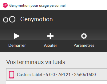 Lancez un émulateur [GenyMotion] pour une tablette Android (voir paragraphe 11.1) :