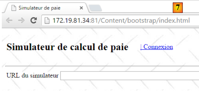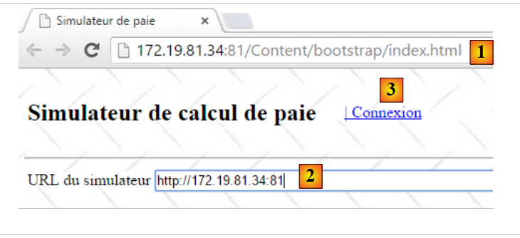 Mettez en [1], l'URL du simulateur comme il a été décrit au paragraphe 9.27.3. Ceci fait, connectez-vous au simulateur avec le lien [2] :