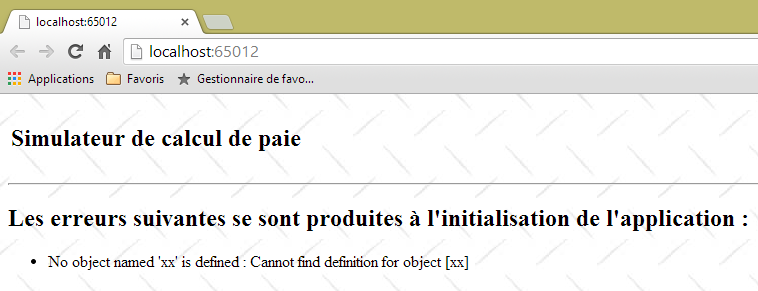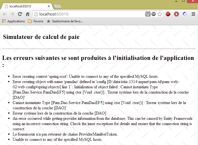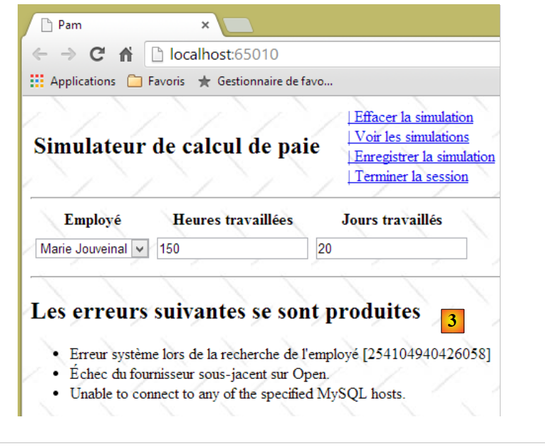 - la vue [VueErreurs] qui indique une ou plusieurs erreurs (ici le SGBD MySQL a été arrêté) :