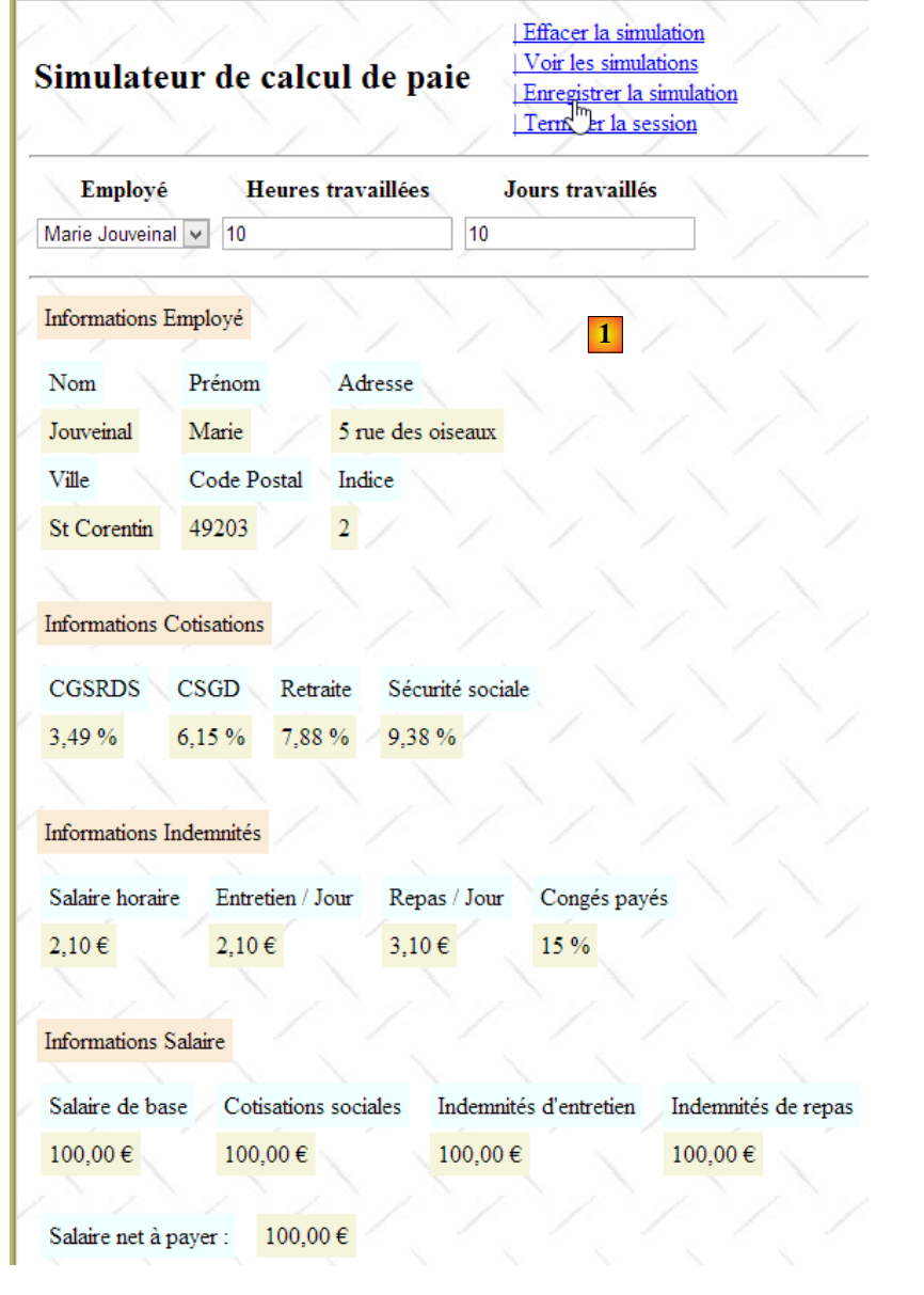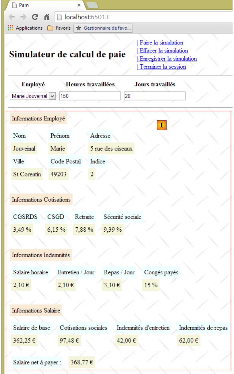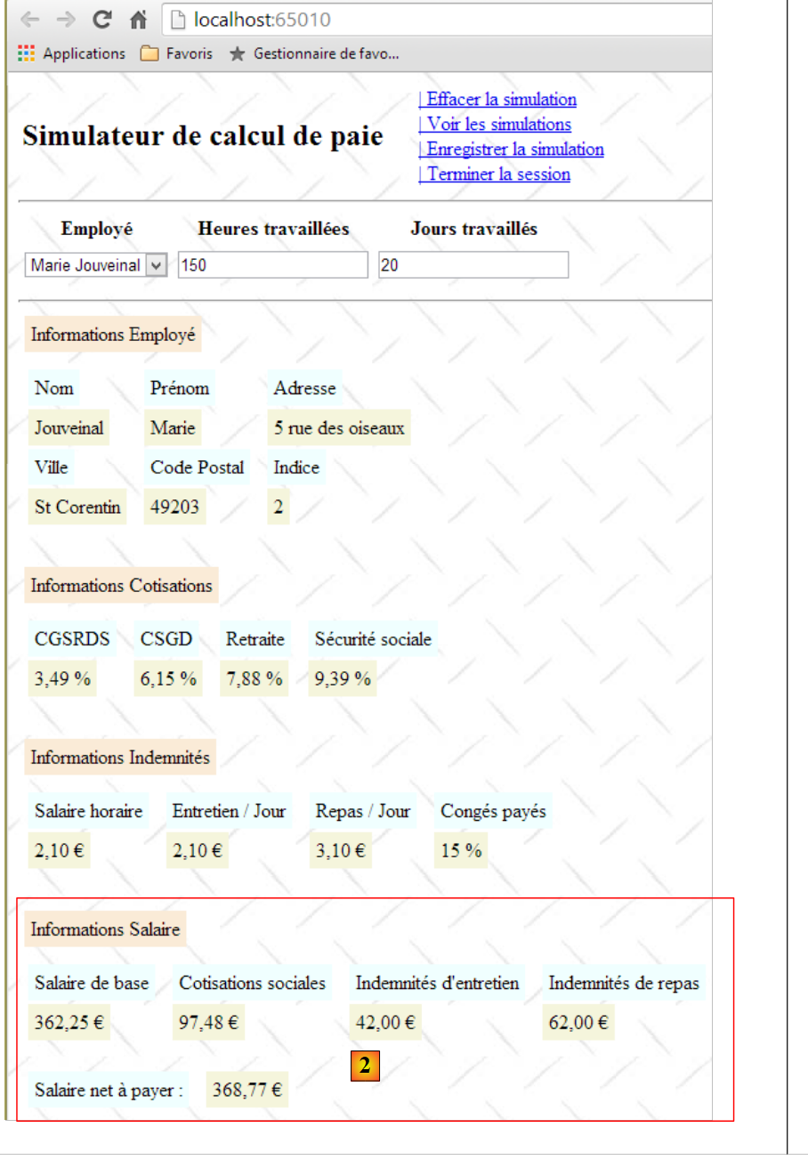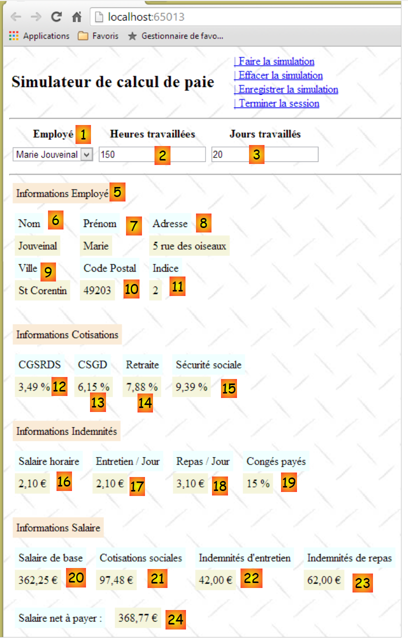 - les informations 20 à 24 sont les éléments du salaire calculés à partir des saisies 1 à 3 faites par l'utilisateur.
