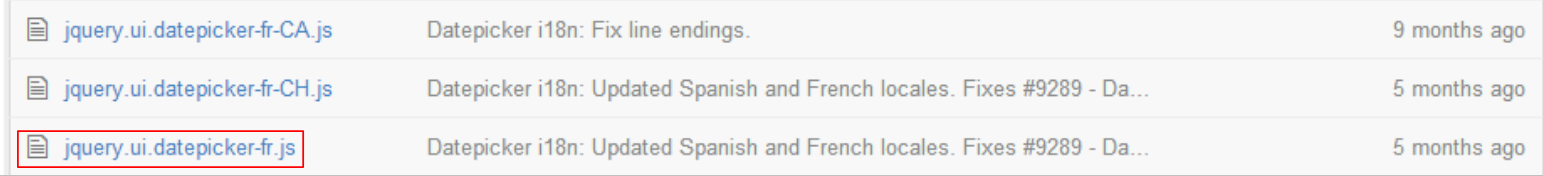 Le calendrier JQuery UI est par défaut en anglais. Pour être internationalisé, il faut ajouter des scripts qu'on peut trouver à l'URL [https://github.com/jquery/jquery-ui/tree/master/ui/i18n] :
