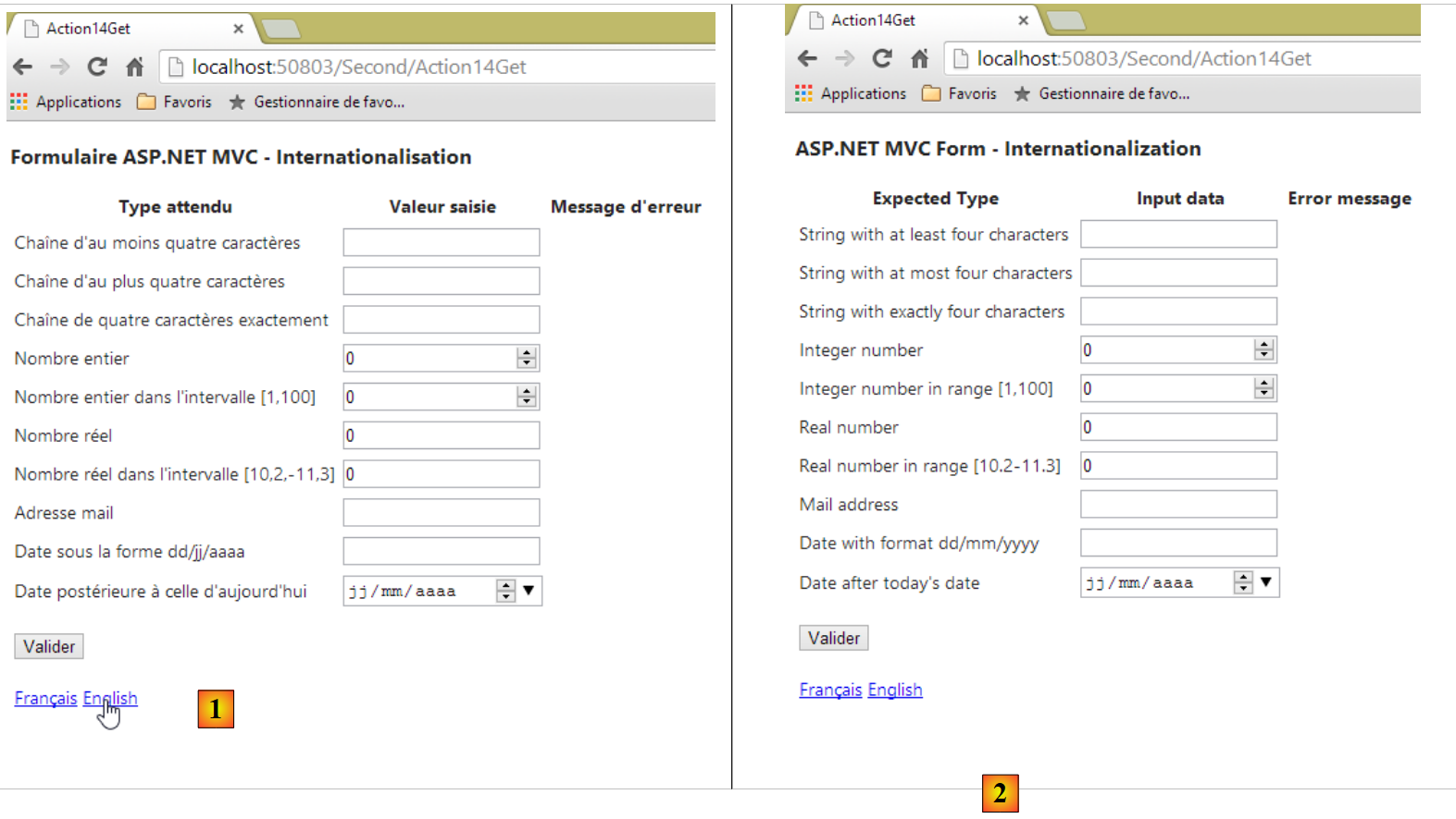 Abordons maintenant l'internationalisation des vues. Nous allons continuer avec l'exemple du formulaire précédent en l'offrant en deux langues : français et anglais.