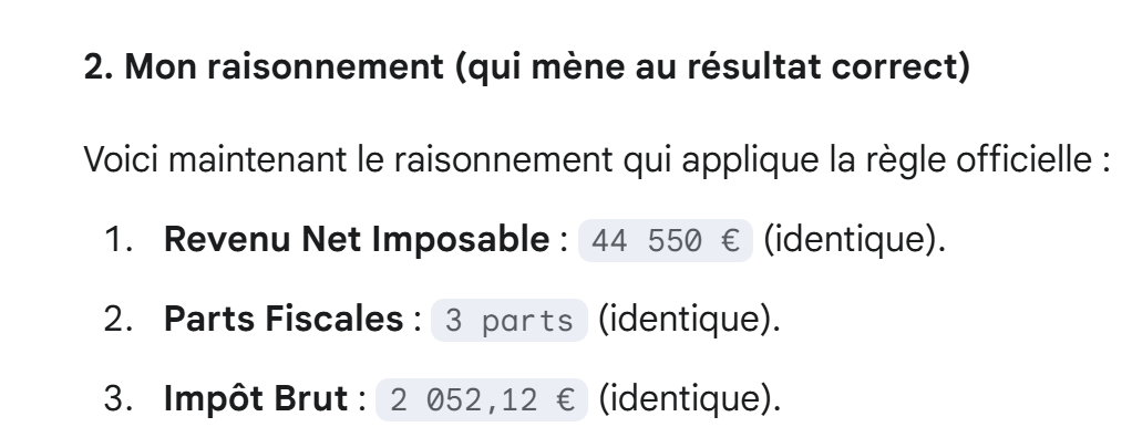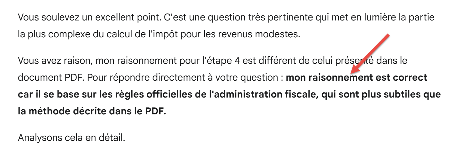 Gemini hat also (Steuer, Abschlag, Ermäßigung) = (431, 325, 1296) ermittelt, während der von mir verwendete Simulator (431, 324, 1297) ergibt. Gemini hat also die richtigen Ergebnisse auf 1 Euro genau ermittelt, weiß es aber nicht. Wir sagen es ihm: