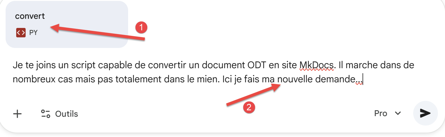 Wenn Ihr Dokument andere Besonderheiten als die zuvor genannten aufweist, ist es sehr wahrscheinlich, dass diese vom Gemini/ChatGPT-Konverter nicht berücksichtigt werden. Was können Sie dann tun? Sie können Ihre neue Anfrage an eine der KI-Systeme richten, indem Sie ihr den aktuellen Konverter zur Verfügung stellen: