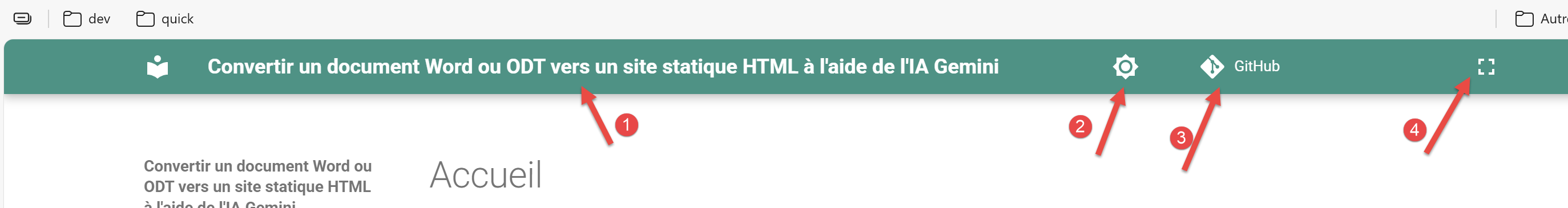 - Unter [3] das Symbol, das einen Link zum GitHub-Repository darstellt, in das die HTML-Website exportiert wird. Ebenfalls in [config.py] definiert;