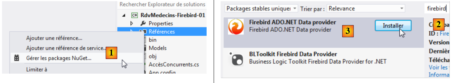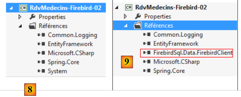- en [9], on y a ajouté le connecteur ADO.NET de Firebird avec l'outil NuGet.