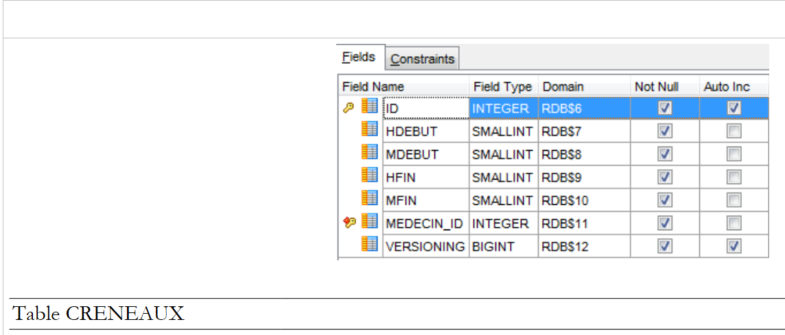 - [CRENEAUX_ID_GEN] sera utilisé pour générer la clé primaire de la table [CRENEAUX] ;