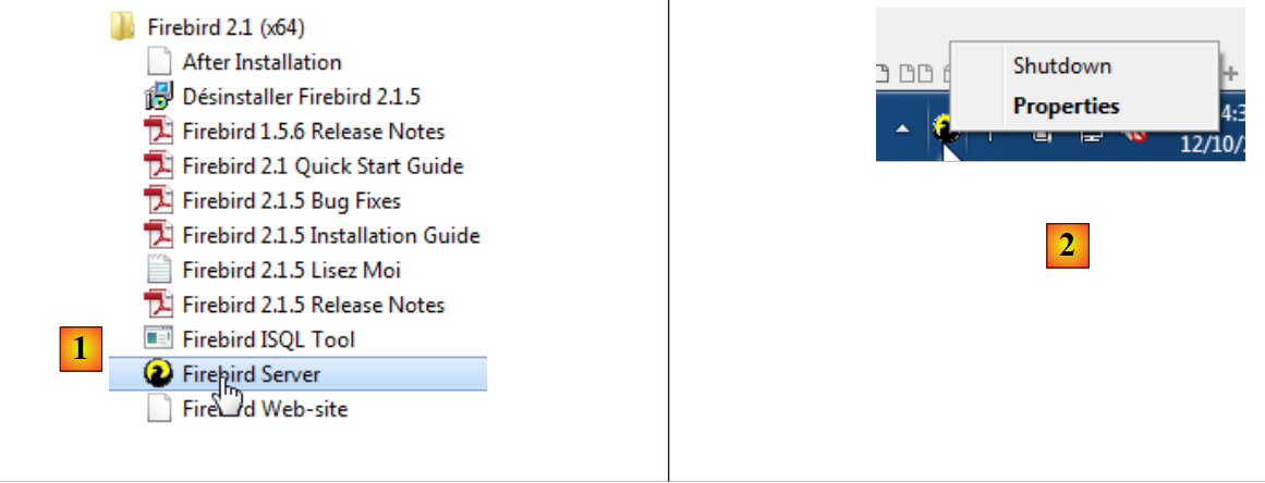 - en [1], nous lançons le SGBD Firebird à partir du Menu Démarrer. Ici, le SGBD n'a pas été installé comme un service Windows ;