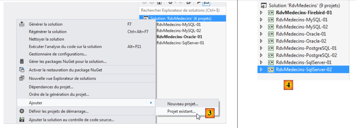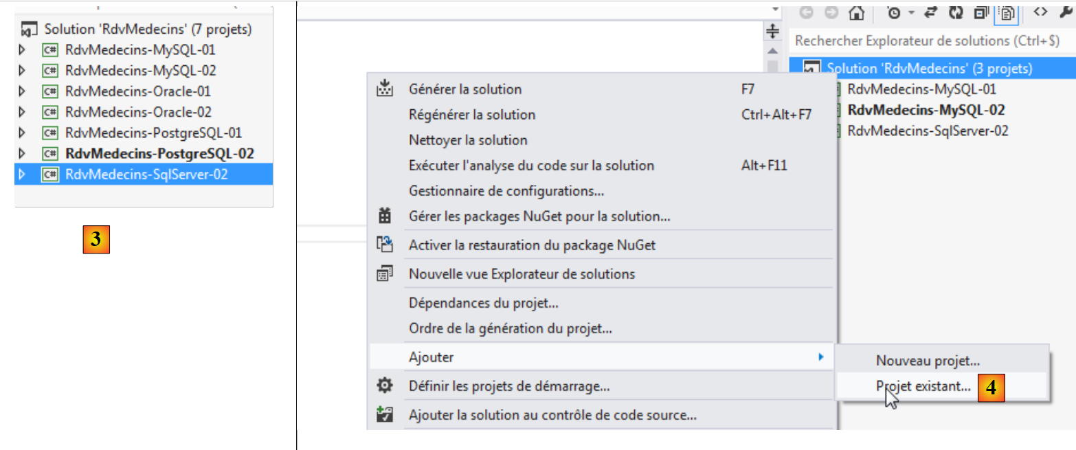 - en [3], on ajoute un projet existant à la solution. On le prend dans le dossier [RdvMedecins-Firebird-02] qui vient d'être créé ;