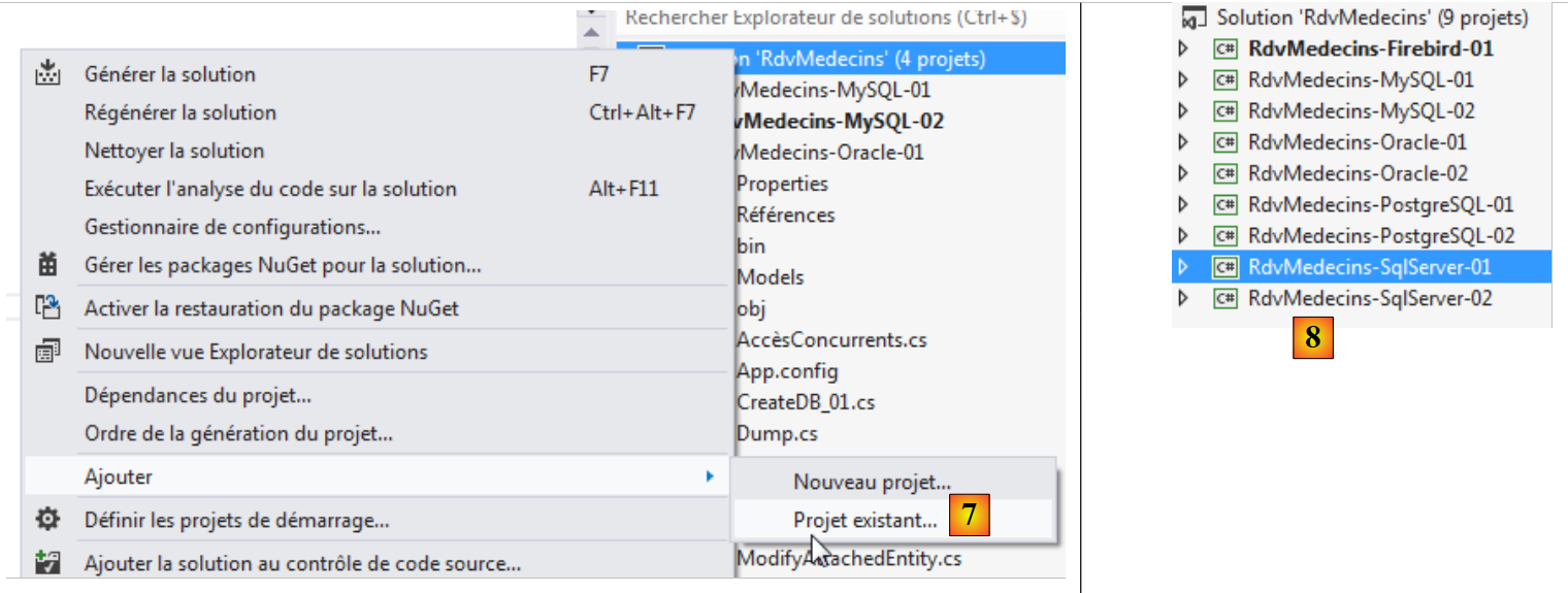 - en [7], on rajoute un autre projet à la solution. Celui-ci est pris dans le dossier [RdvMedecins-SqlServer-01] du projet que nous avons supprimé de la solution précédemment ;