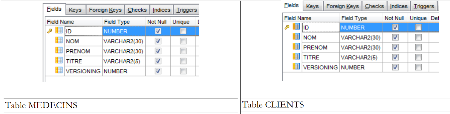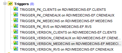 Les triggers [TRIGGER_VERSION_MEDECINS, TRIGGER_VERSION_CRENEAUX, TRIGGER_VERSION_RVS] sont analogues. Les quatre colonnes [VERSIONING] tirent leur valeurs de la même séquence.