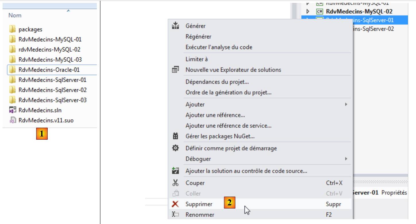 - en [2], dans VS 2012, nous supprimons le projet [RdvMedecins-SqlServer-01] de la solution ;