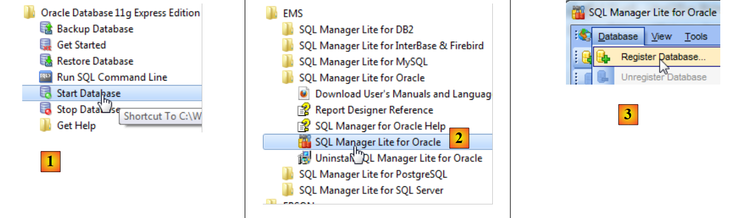 Lançons Oracle [1] puis l'outil [SQL Manager Lite for Oracle] avec lequel on va administrer le SGBD [2].