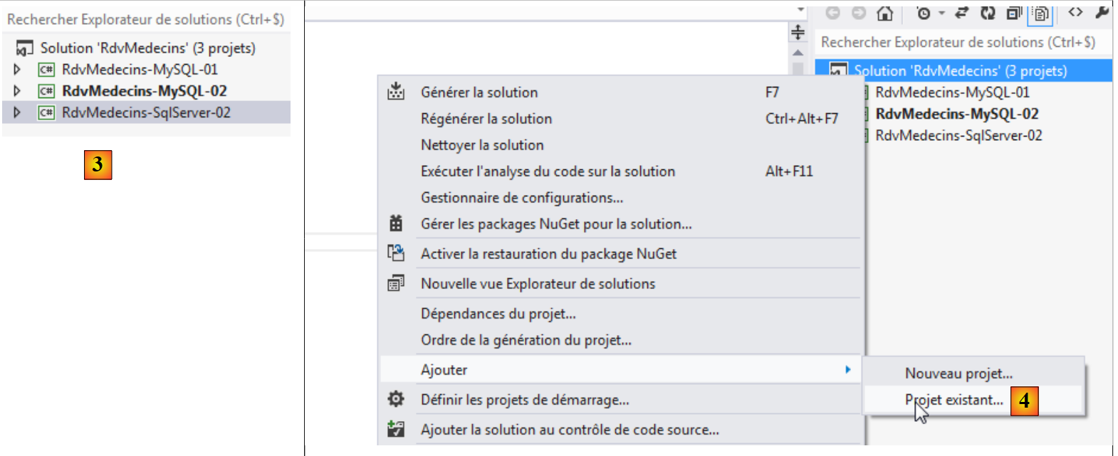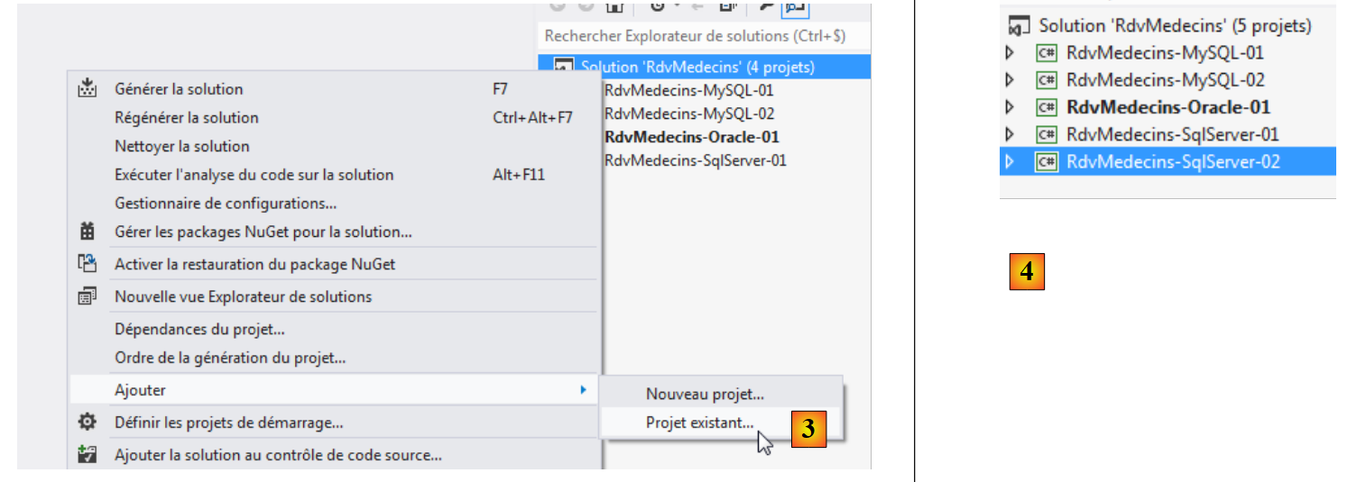 - en [3], on ajoute un projet existant à la solution. On le prend dans le dossier [RdvMedecins-Oracle-02] qui vient d'être créé ;