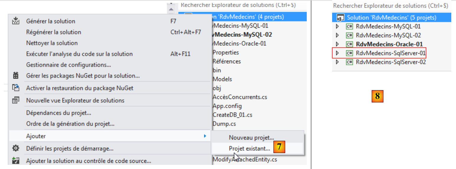 - en [7], on rajoute un autre projet à la solution. Celui-ci est pris dans le dossier [RdvMedecins-SqlServer-01] du projet que nous avons supprimé de la solution précédemment ;