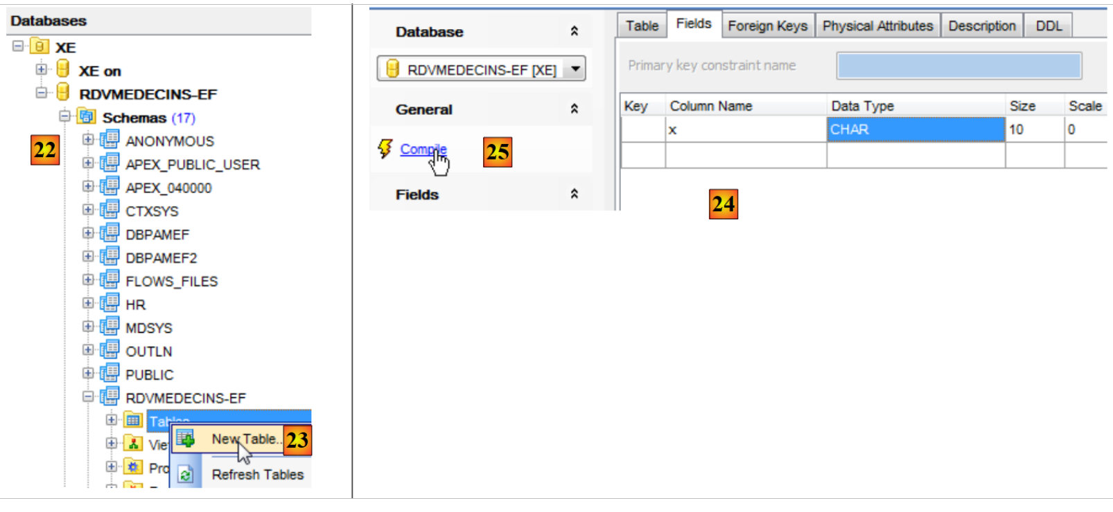 Nous sommes amenés alors à construire la base de données [RDVMEDECINS-EF] à la main avec l'outil [EMS Manager for Oracle]. Nous ne décrivons pas toutes les étapes mais simplement les plus importantes.