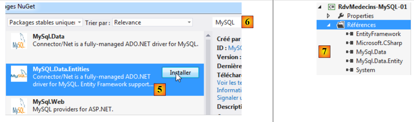 - en [5], on recommence pour ajouter cette fois [MySQL.Data.Entities] qui est un connecteur ADO.NET pour Entity Framework. Pour trouver le paquetage, on peut se faire aider par la zone de recherche [6] ;