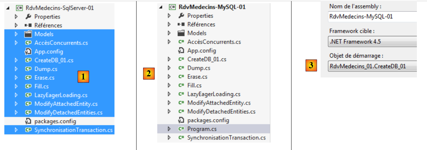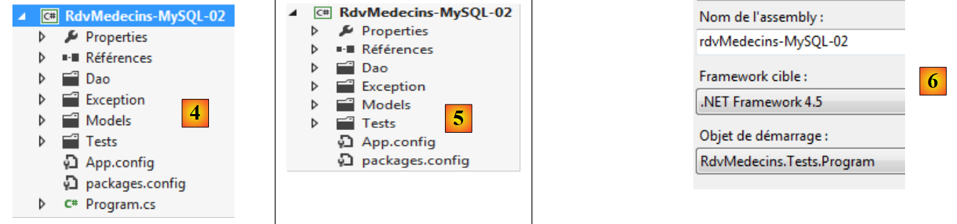 - en [4], les dossiers [Dao, Exception, Tests] et le fichier [App.config] sont recopiés du projet [RdvMedecins-SqlServer-02] ;