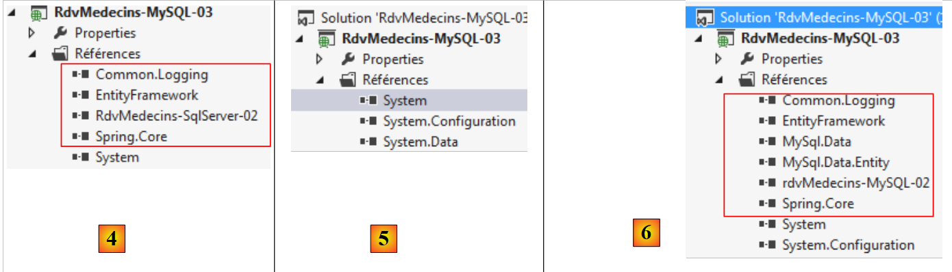 - en [2], les références [Common.Logging, EntityFramework, MySql.Data, MySql.Data.Entity, Spring.Core] sont ajoutées avec NuGet ;