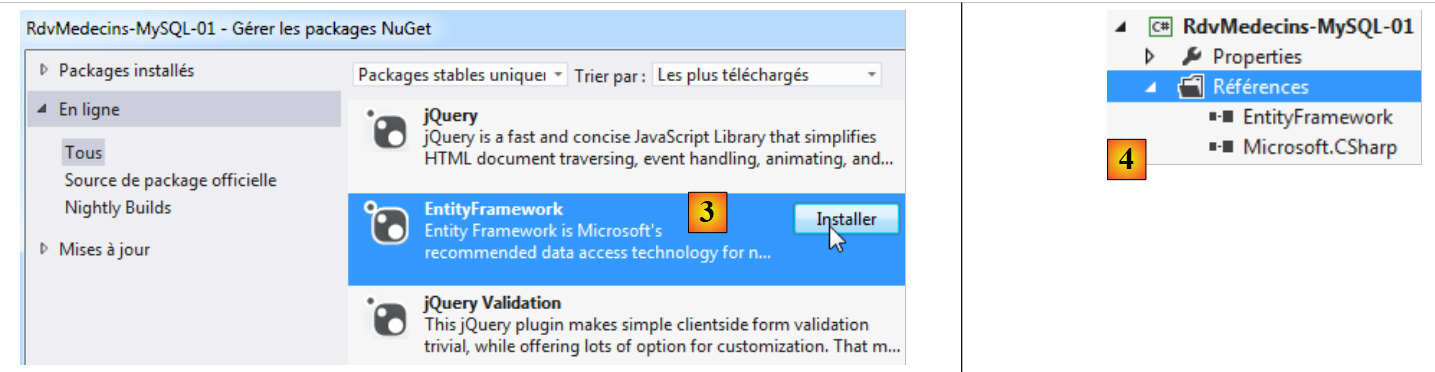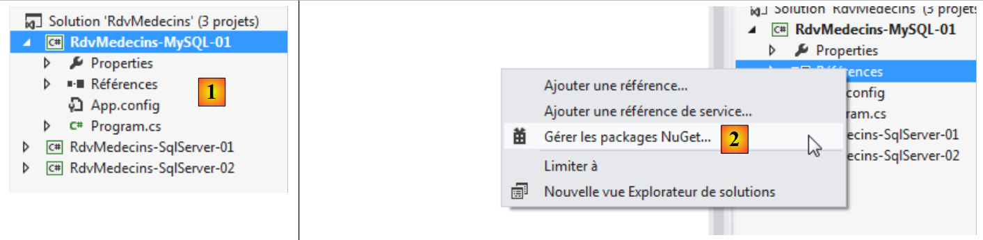 - en [7], apparaissent deux références [MySQL.Data.Entities] et [MySQL.Data], la dernière étant une dépendance de la première.