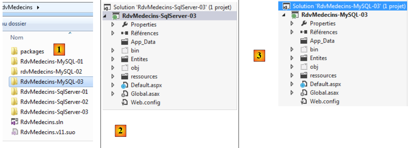 Nous allons partir du projet [RdvMedecins-SqlServer-03]. Nous dupliquons le dossier de ce projet dans [RdvMedecins-MySQL-03] [1] :