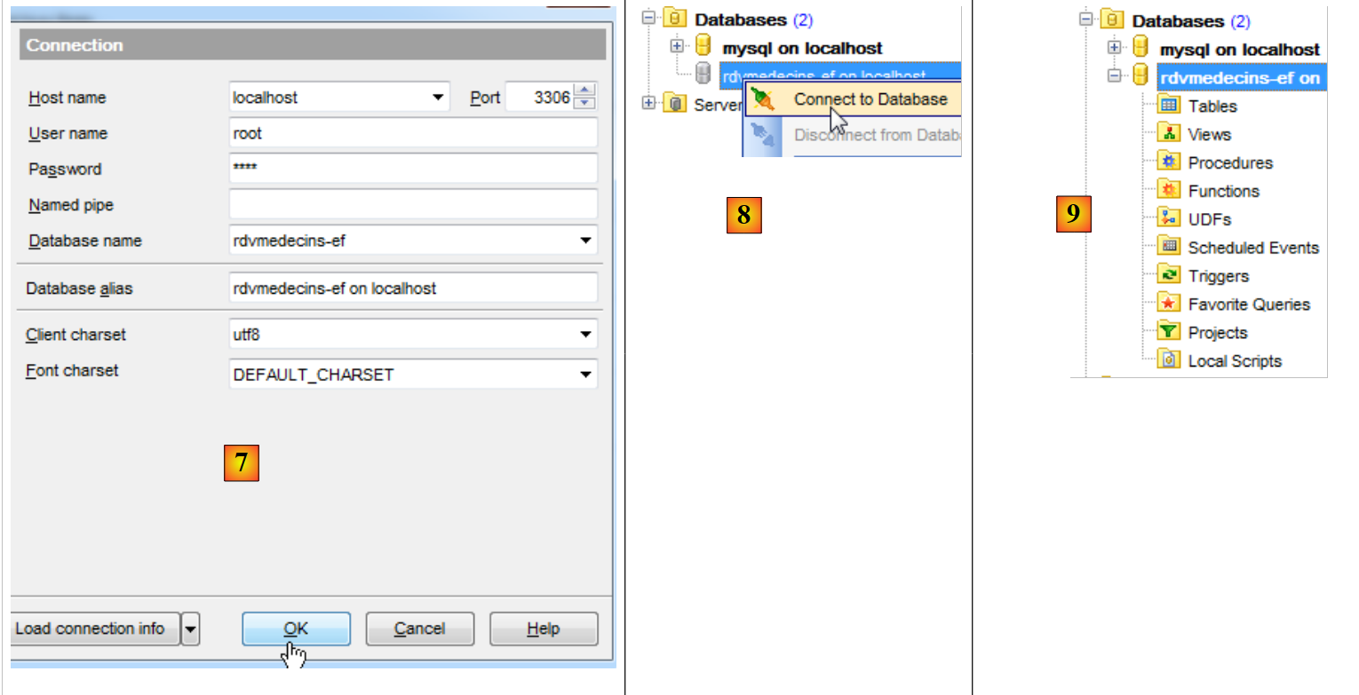 - en [7], la base a été créée. Elle doit maintennat être enregistrée dans [EMS Manager]. Les informations sont bonnes. On fait [OK] ;