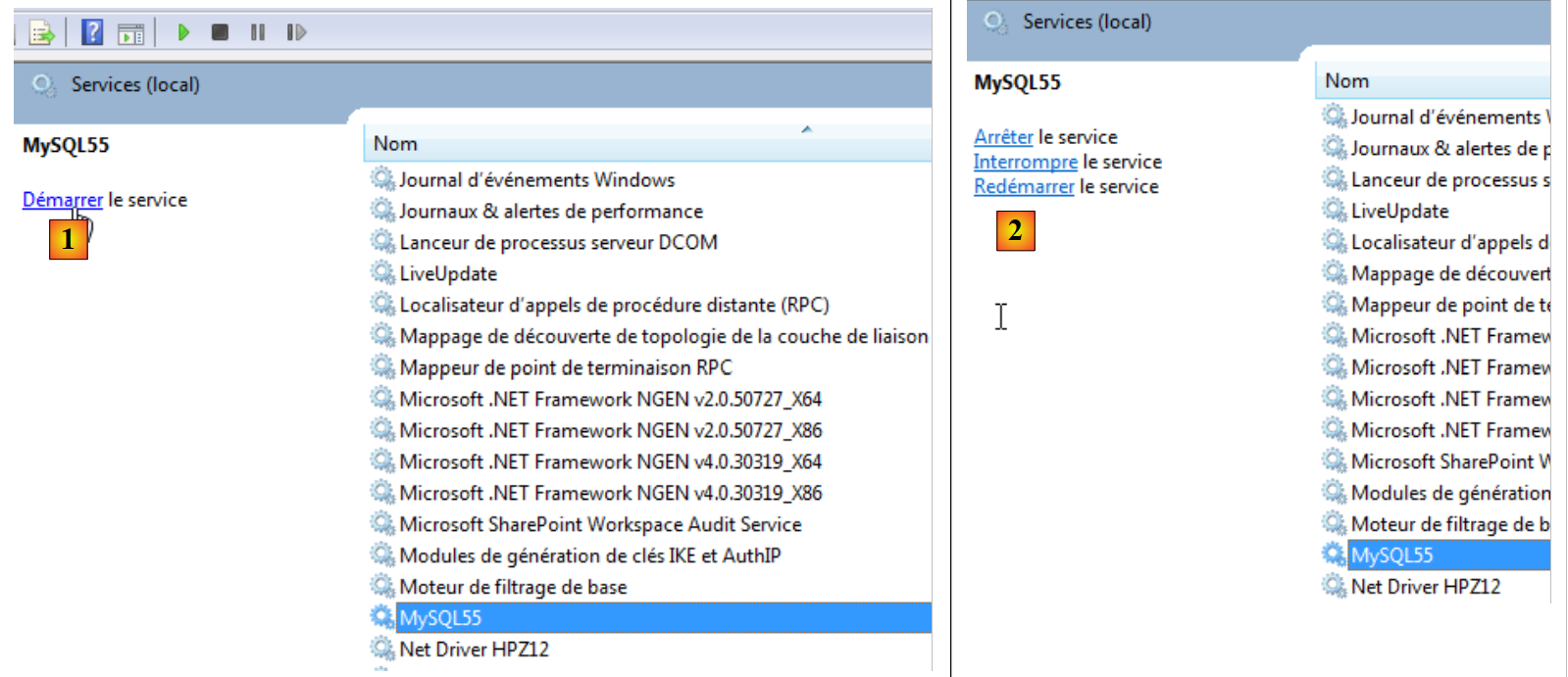 Lançons MySQL5. ici, nous le faisons à partir de la fenêtre des services Windows [1]. En [2], le SGBD est lancé.