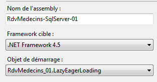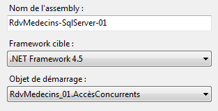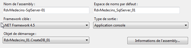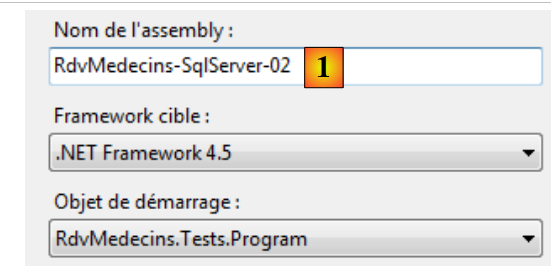 - ligne 23 : définition d'un objet. L'attribut id est libre. C'est l'identifiant de l'objet. L'attribut type désigne la classe à instancier sous la forme " nom complet de la classe, Assembly qui contient la classe". La classe ici est celle qui implémente la couche [DAO] : [RdvMedecins.Dao.Dao]. Pour connaître son assembly, il faut regarder les propriétés du projet :