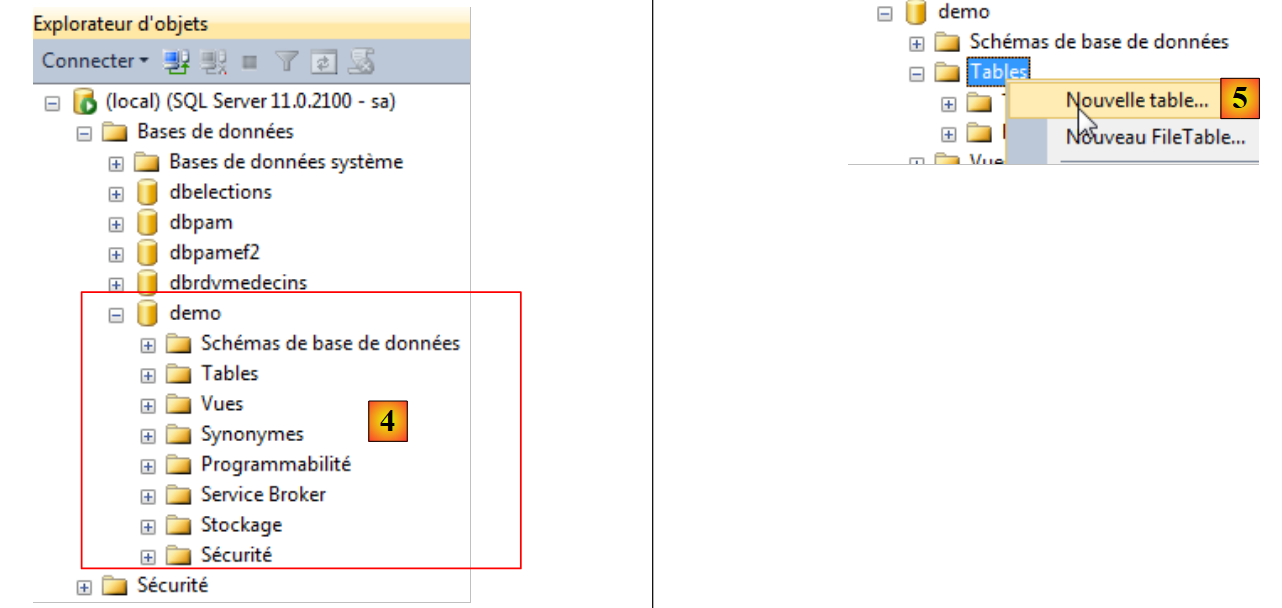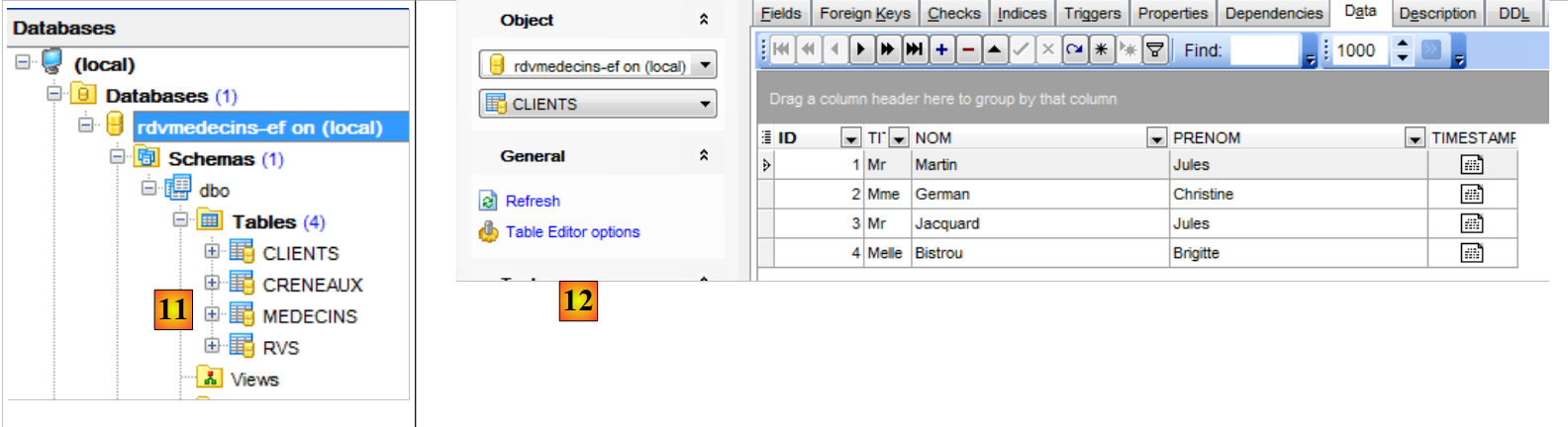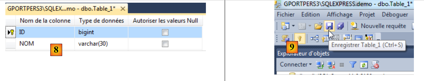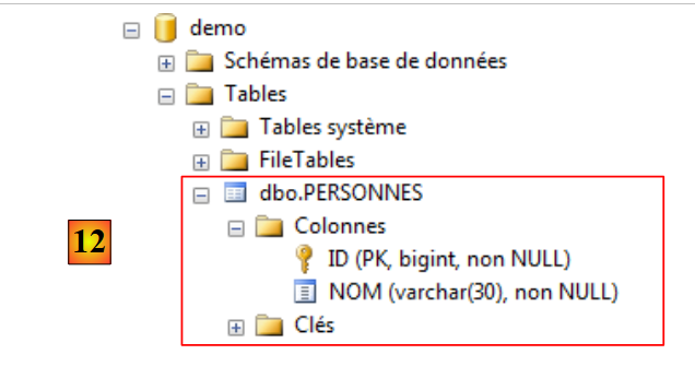 - en [11], pour que la table apparaisse dans la base [demo], il faut actualiser la base ;