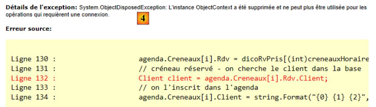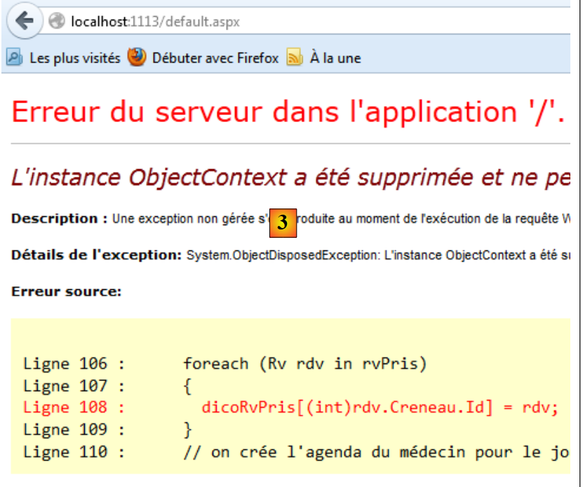 Lorsqu'on examine le texte d'erreur affiché par la page, on s'aperçoit que l'exception signalée est celle du Lazy Loading : on a essayé de charger une dépendance d'un objet alors que le contexte de persistance qui le gère a été fermé. L'objet est maintenant dans un état " détaché ". Cette erreur est due au fait que par que NHibernate avait été utilisé en mode Eager Loading alors que EF 5 travaille par défaut en Lazy Loading. Sur la ligne en rouge ci-dessus :