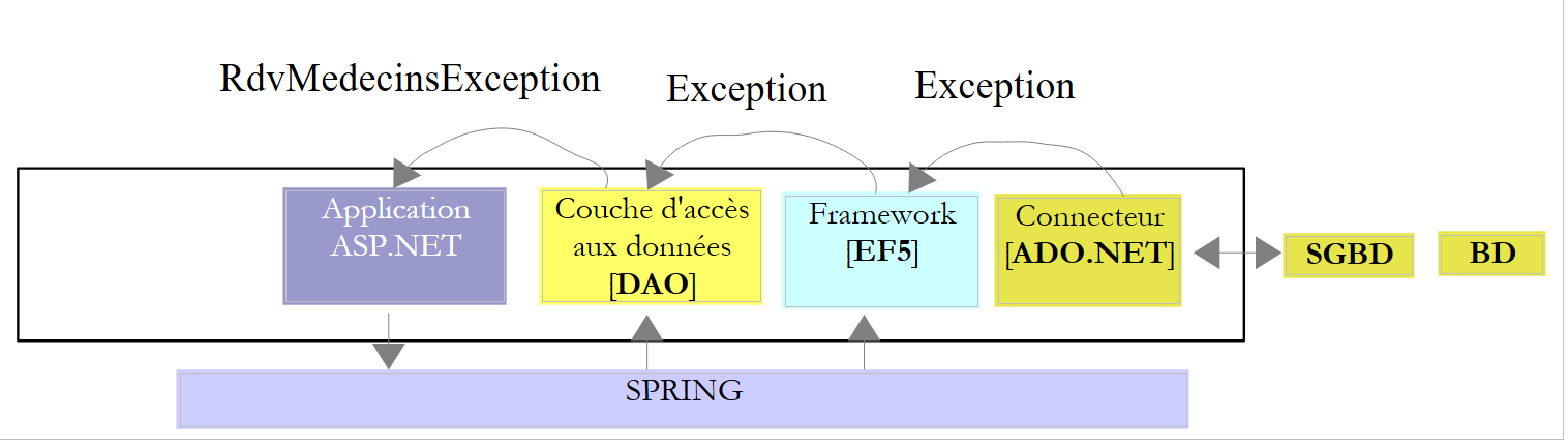 - ContextRegistry.GetContext().GetObject("rdvmedecinsDao") exploite la section des lignes 5-7. Elle ramène une référence sur l'objet qui a l'attribut id= "rdvmedecinsDao ". C'est l'objet défini ligne 6. Spring va alors instancier la classe définie par l'attribut type en utilisant son constructeur sans paramètres. Celui-ci doit donc exister. Ceci fait, la référence de l'objet créé est rendue au code appelant. Si l'objet est demandé une seconde fois dans le code, Spring se contente de rendre une référence sur le premier objet créé. C'est le modèle de conception (Design Pattern) appelé singleton.