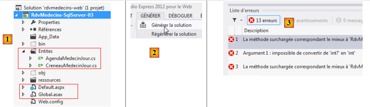 Le type de [medecin.Id] est int? alors que la méthode [GetCreneauxMedecin] est de type int. Il faut donc un cast. Cette erreur est récurrente dans tout le code car les entités du projet ASP.NET / NHibernate avaient des clés primaires de type int alors que celles du projet ASP.NET / EF 5 sont de type int?. On corrige toutes les erreurs de ce type et on régénère le projet. Il n'y en a alors plus.