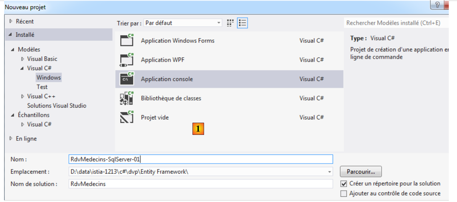 Entity Framework 5 Code First permet de créer une base de données à partir des entités. C'est ce que nous voyons maintenant. Avec VS Express 2012, nous créons un premier projet console en C# :
