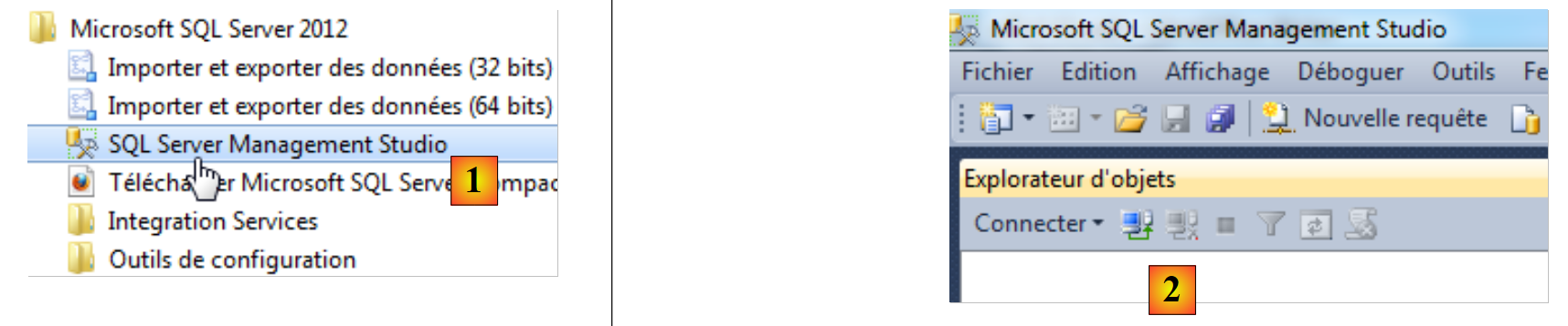- [1] : dans le Menu Démarrer, lancer " SQL Server Management Studio " ;