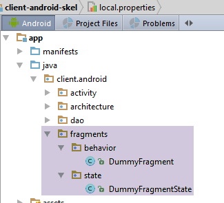 We now provide a skeleton for an Android application communicating with one or more web services / JSON. This is the [client-android-skel] project, which can be found in the [architecture] folder of the examples:
