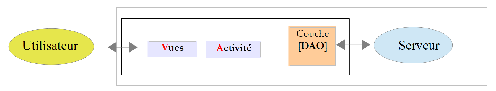 - there is only one activity that also implements the [IDao] interface. The views call upon it to access the server;