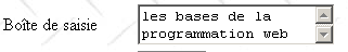 <textarea rows="2" name="inputArea" cols="20"> line1 line2 line3 </textarea> | ![]() | areaSaisie=the+basics+of+web%0D%0A web+programming - text typed by the user in the input field. %OD%OA is the end-of-line marker. Spaces have been replaced by the + sign |