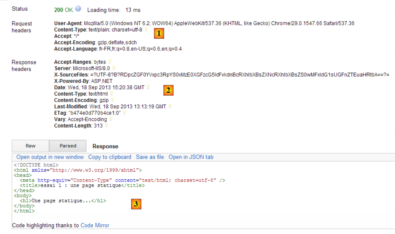 Above [1, 2], we see the HTTP headers sent by the browser. They have been formatted here. To view the raw text of these headers, we follow the [view source] link [3, 4]. The complete text is as follows: