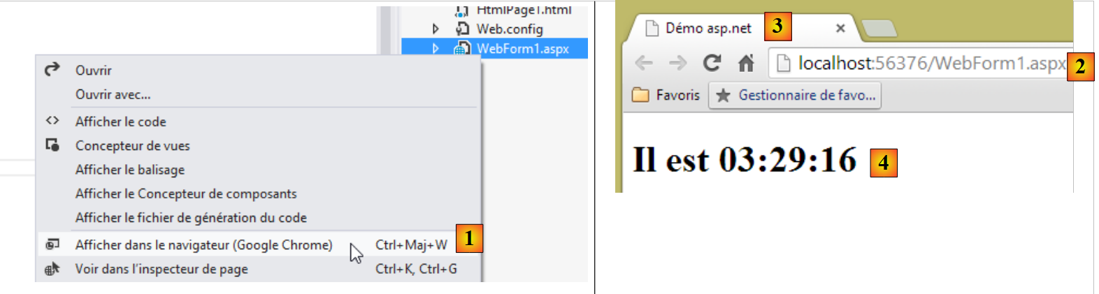 - line 13: we display text generated by C# code. This code is enclosed in <% %> tags. This C# code displays the current time in the format hours:minutes:seconds.