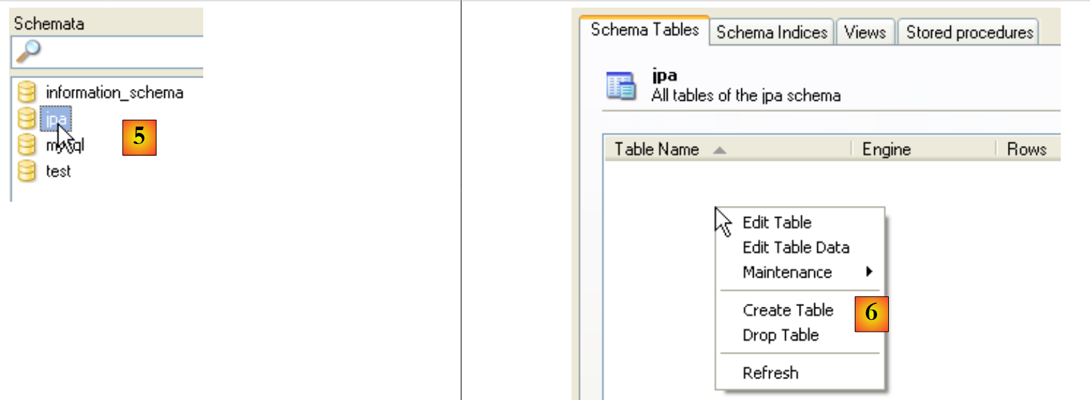 - in [6]: the objects in the [jpa] schema appear, including the tables. There aren’t any yet. Right-clicking would allow you to create them. We’ll leave that to the reader.
