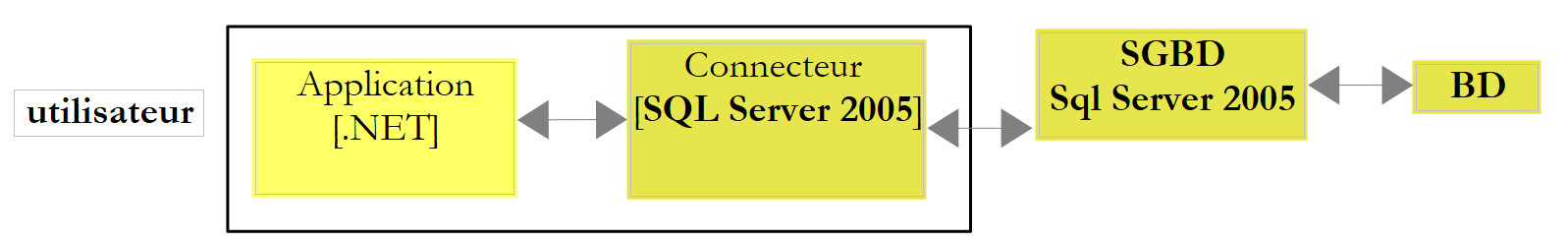 The ADO.NET connector is the set of classes that allow a .NET application to use the SQL Server Express 2005 DBMS. The connector classes are in the [System.Data] namespace, natively available on any .NET platform.