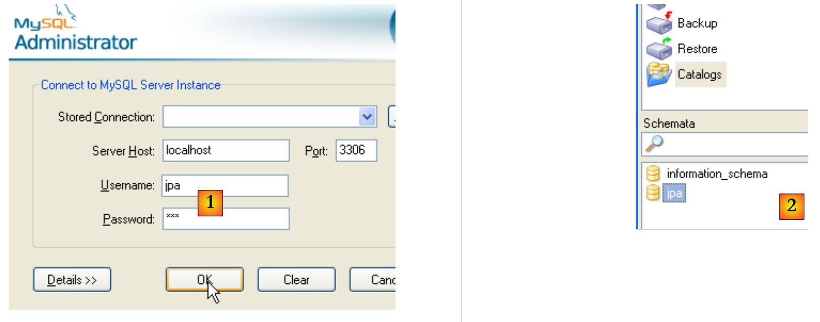 To verify that the user [jpa] can work with the [jpa] schema, close the MySQL administrator. Restart it and log in this time as [jpa/jpa]: