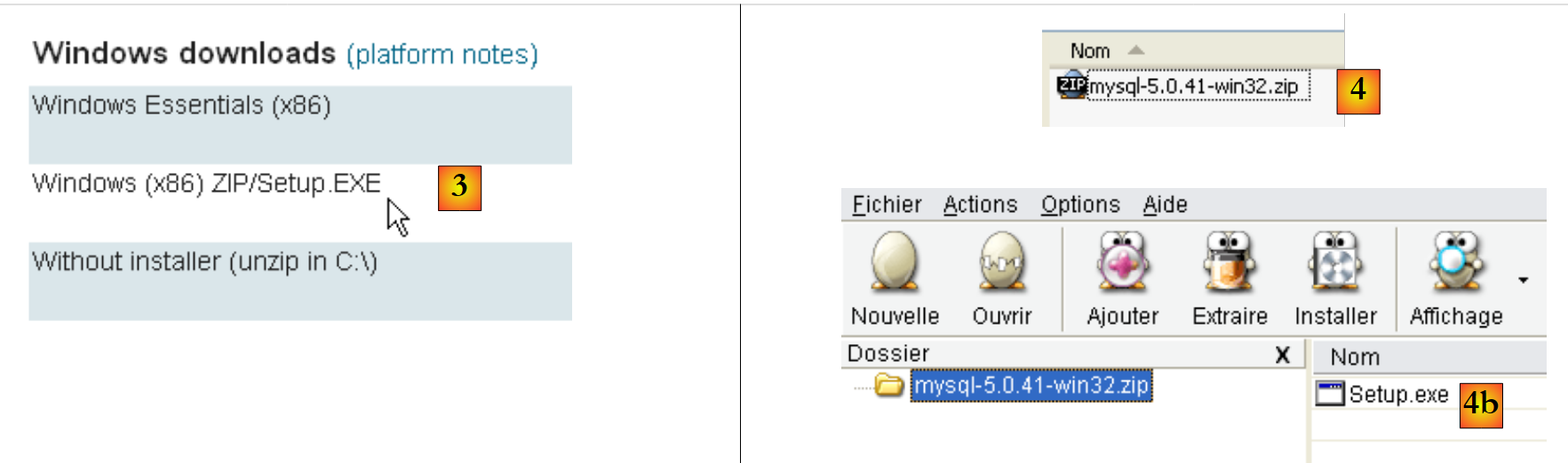 - in [4]: the downloaded ZIP file contains an executable [Setup.exe] [4b] that you must extract and run to install MySQL5