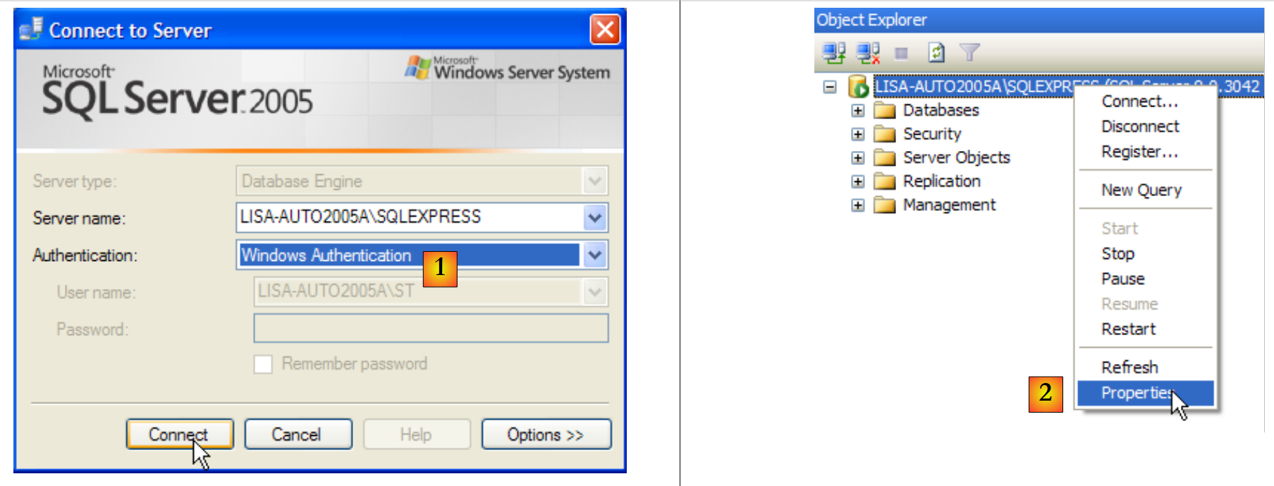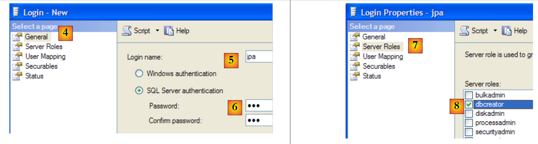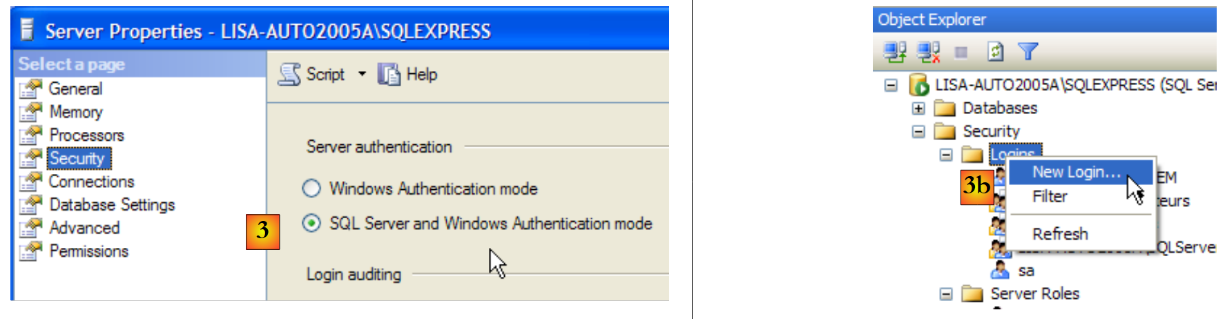 - in [3]: we enable mixed mode for connecting to the server: either with a Windows login (a Windows user) or with a SQL Server login (an account defined within SQL Server, independent of any Windows account).