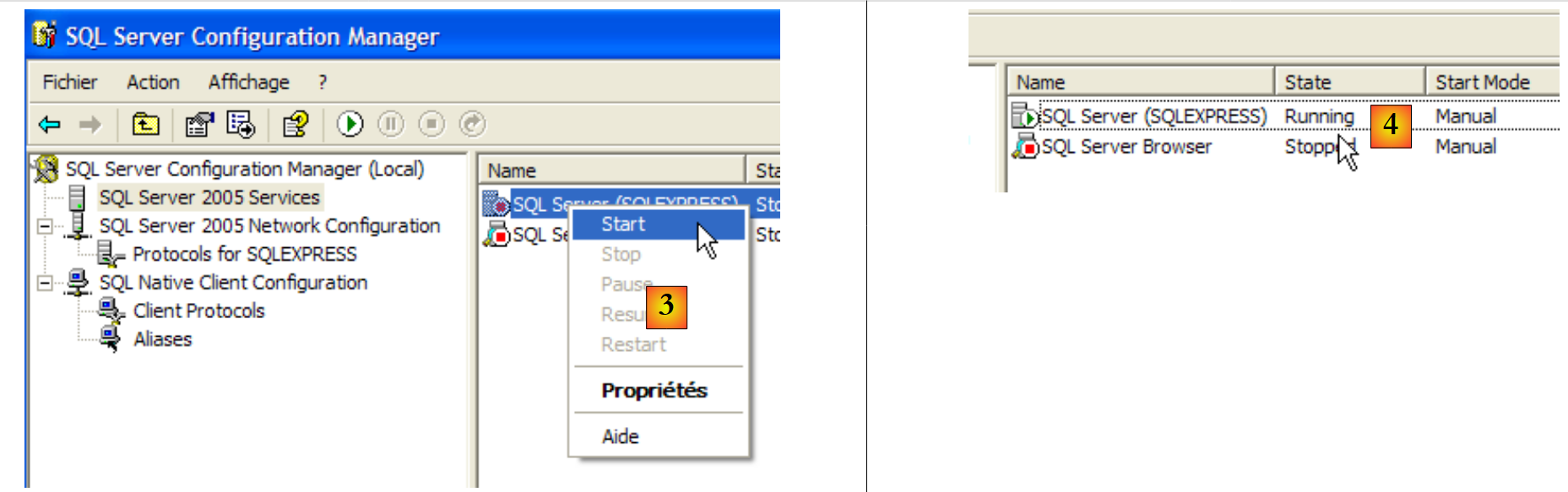 - In [3]: Right-click on the [SQL Server] service to access the server's start/stop options. Here, we start it.