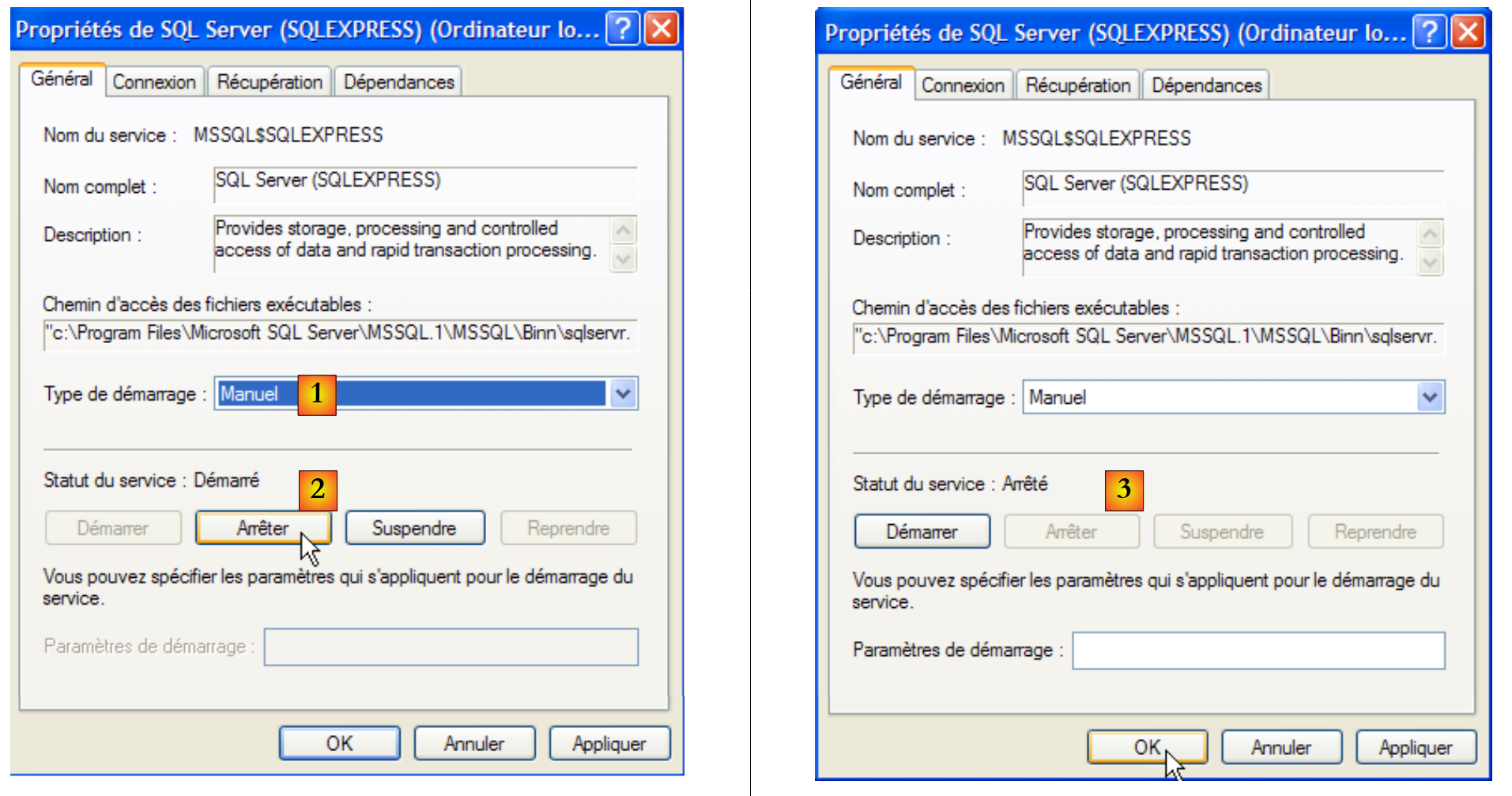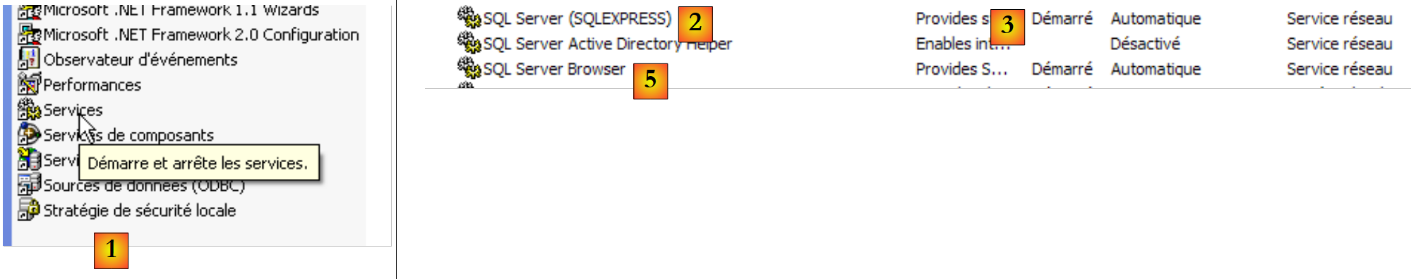 - in [2]: we see that a service called [SQL Server] is present, that it is running [3], and that it starts automatically [4].
